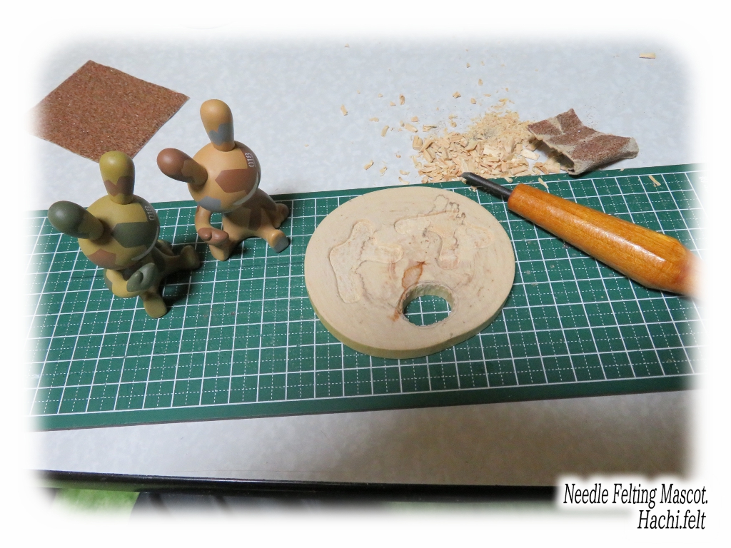 フェルト作品の飾り台に使おうと思って輪切りにして貰ってた白樺、ちょっと大きいので使わずにいたけど今回使う分には丁度良い大きさなのでこれを使いましょう。このまま二人を乗せてもいいんですけど傾いたり振動なんかで滑り落ちちゃうので、置く部分は彫り込んで沈めておきましょう。