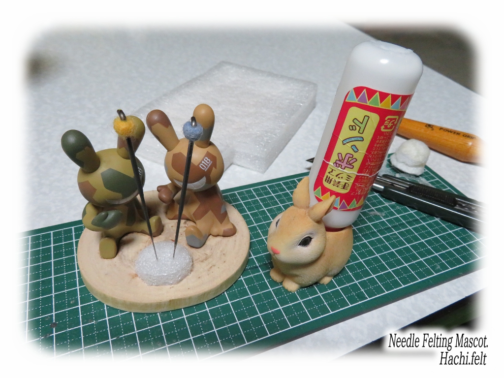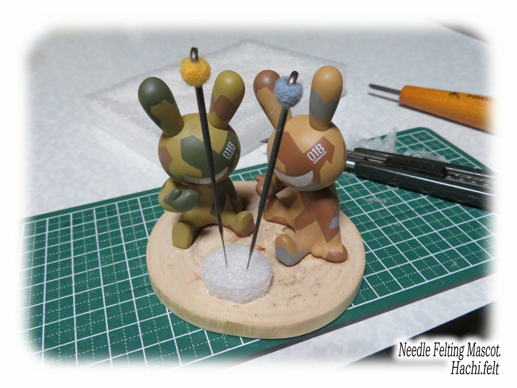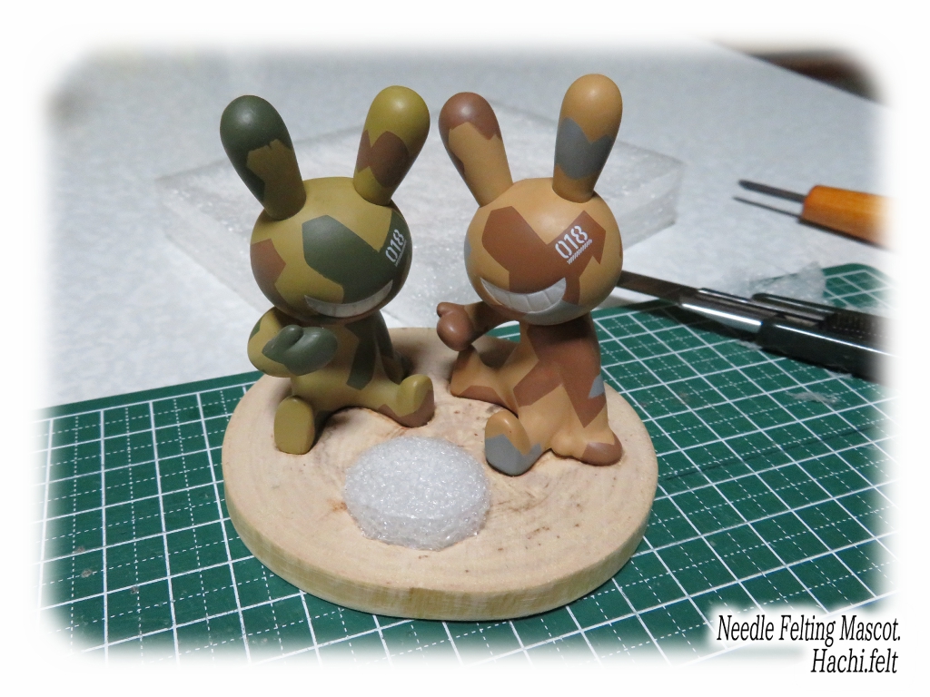 この間ガチャポンで手に入れた BLACR RABBIiT の迷彩カラーの子達。手に入れたら羊毛フェルトで使うニードルのスタンドを作ろうと思ってたのでさっそく作ってみる✨あまり凝る必要も無いので手軽に😆
