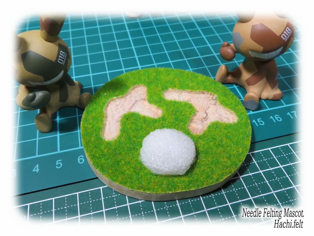 先日作ったニードルスタンド。「これでいいや~」とか言ったものの、木目があまりキレイでないのが気になって結局芝シートを貼りました。