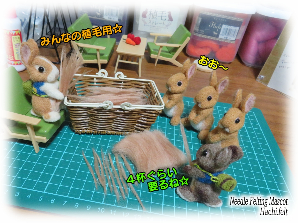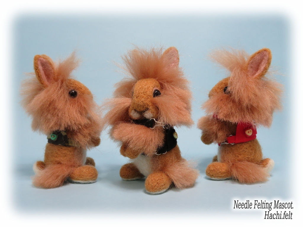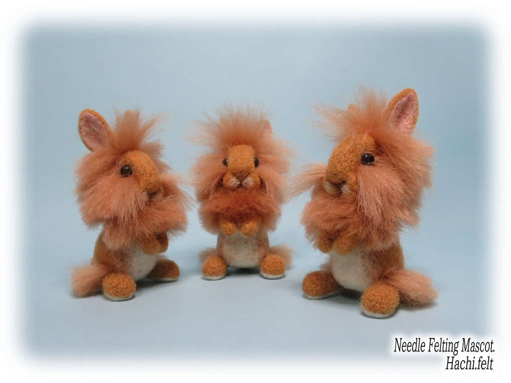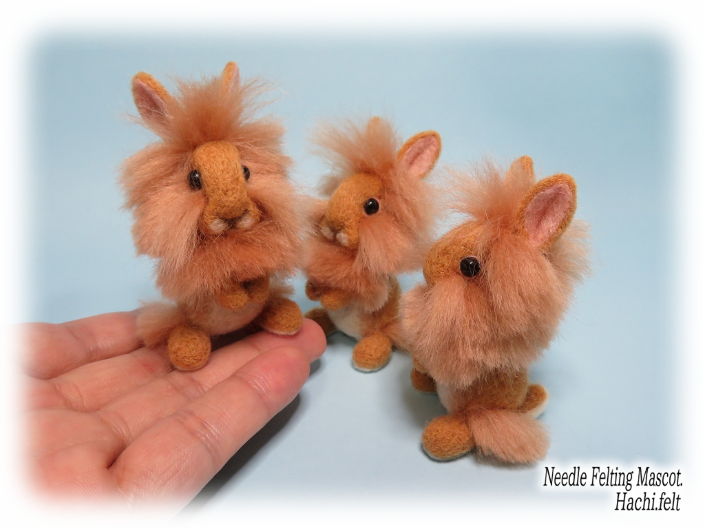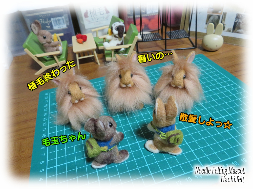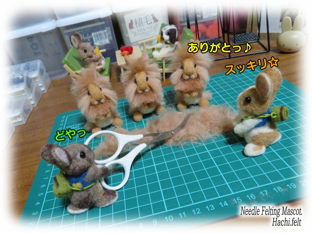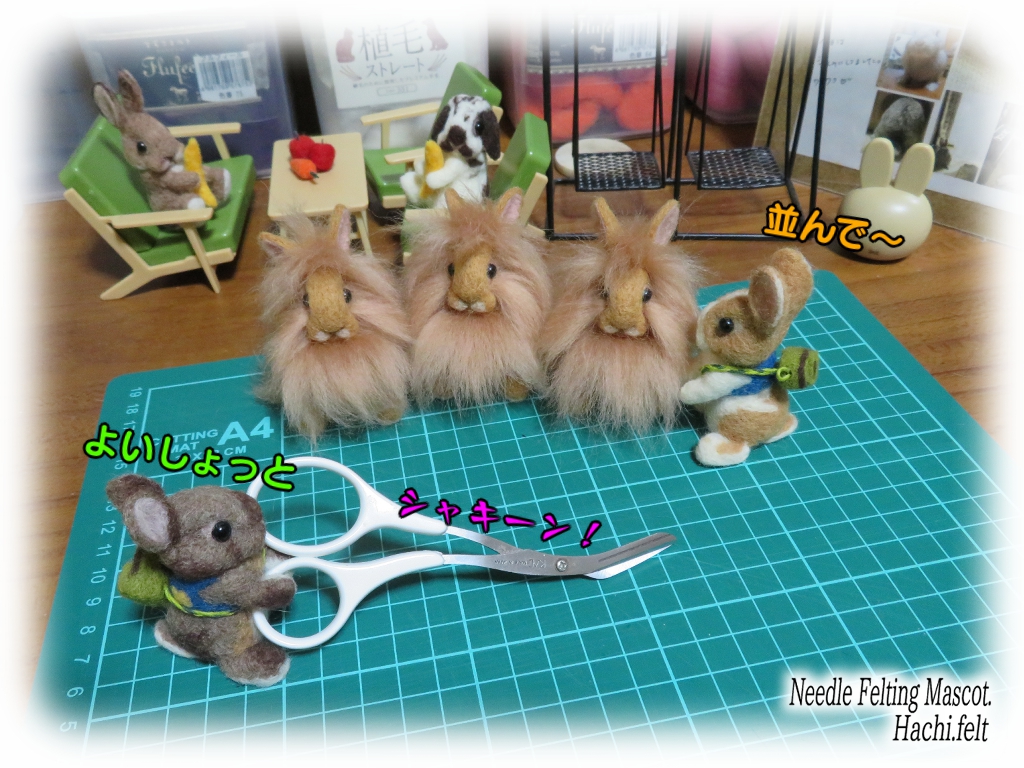 うさぎ追加 03 制作記 X Facebook LINE Pinterest コピー 2022.10.20 ライオンヘッド3羽出来ました。 植毛に使う羊毛は意外と消費します、これがフル植毛になると羊毛の在庫なんてすぐ無くなってしまう🐰植毛する時はチクチク植える度に束から取り出すのは結構めんどくさいので、最初に仕分けしておいてから作業すると楽です。 散髪した羊毛、短く切断した繊維は纏めて刺してもなかなかフェルト化してくれないのでもったいないなぁと思いながらも結局処分してしまう。芯材にでも使えたらな🤔 ~~~~~~~~~~ ミニ八兵衛 散髪は慎重に☆ ミニ茶々丸 切り過ぎたら植毛からやり直しなのだっ💦