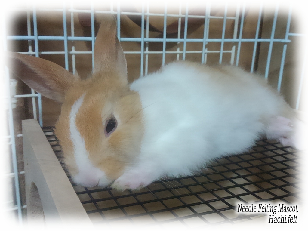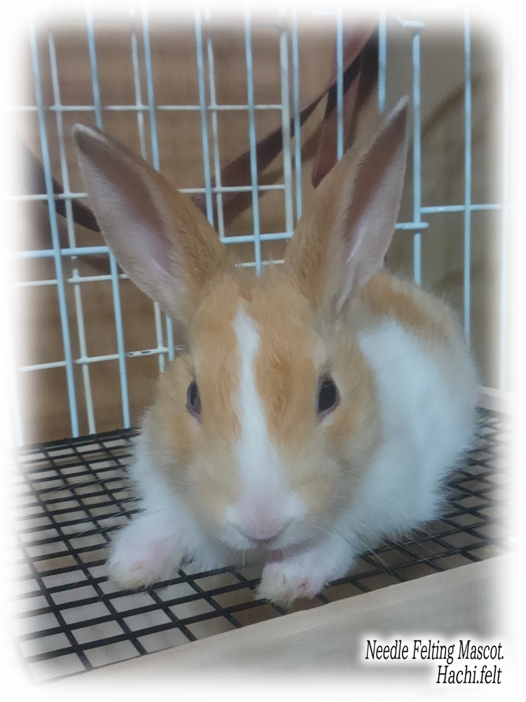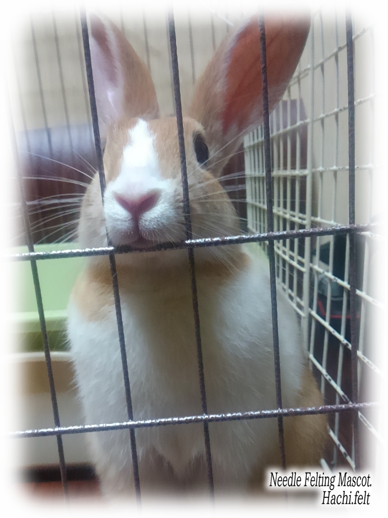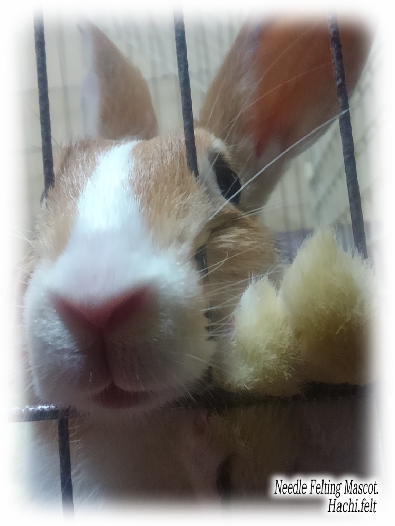 ライオンヘッドは生まれてからの日数の関係でまだ触れる事が出来ないという事で遠目から見てたんですが、ふっと何か横から視線を感じる。横を見るとケージの柵にへばりついて鼻を突きだしてこっちを見ている子うさぎが…それが八ちゃん。
