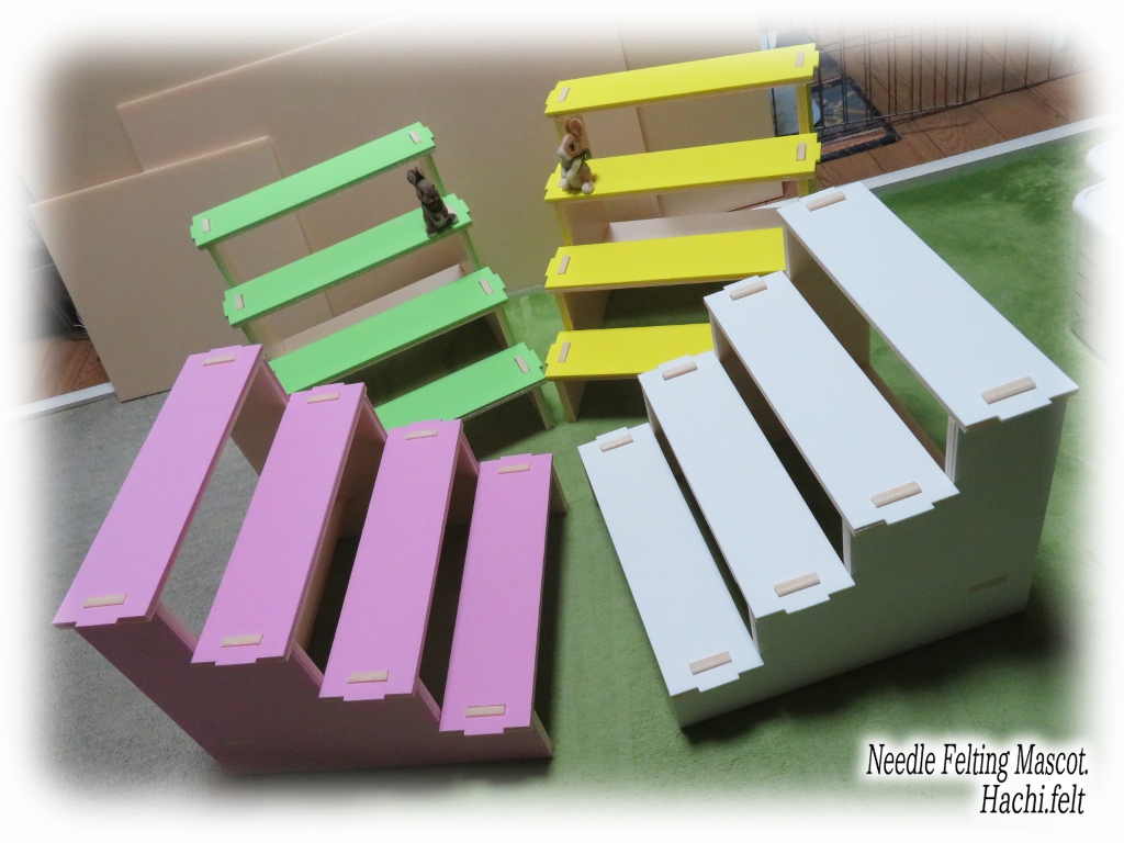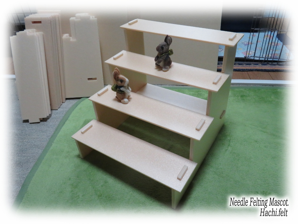 こんな感じ。一段にミニモデルが4体乗るのでひな壇1つで16体並べられます、これを4つ作ってるので64体並べられますね。いや、そんなに作品無いですけど💦