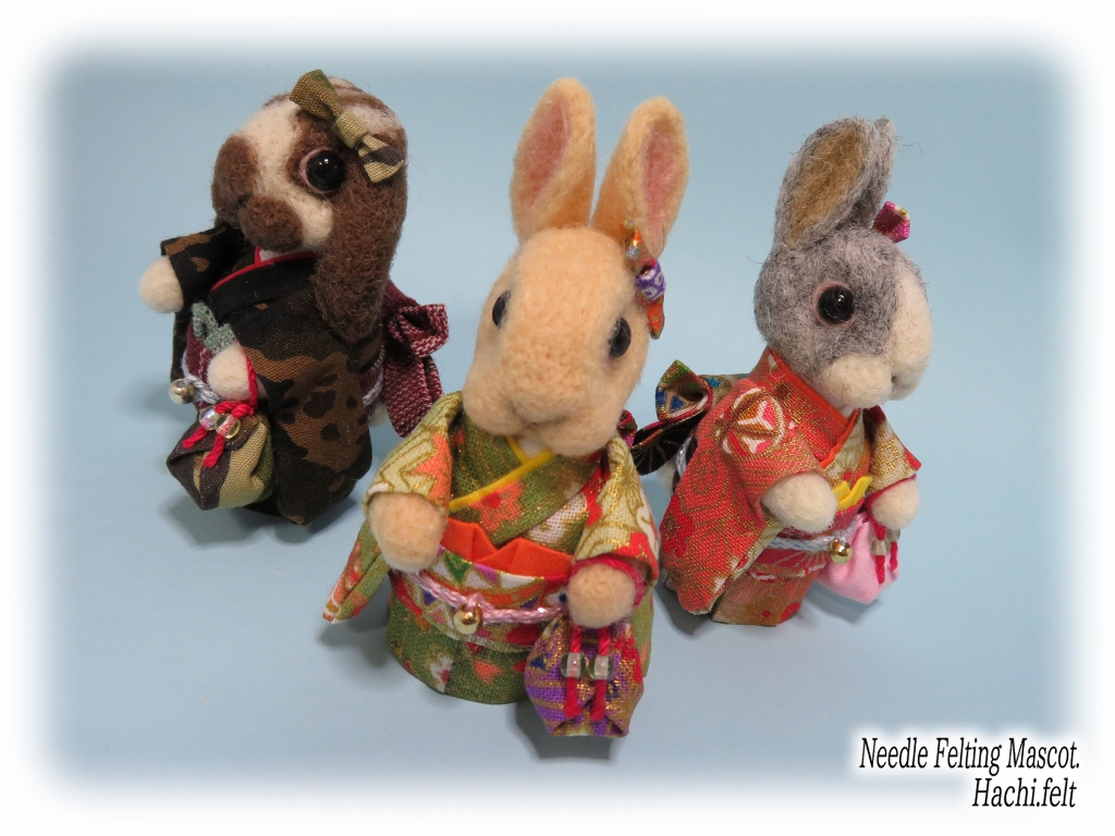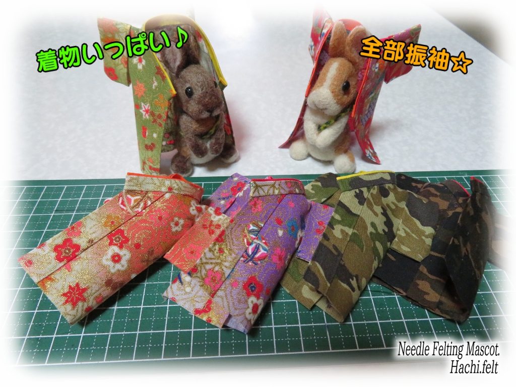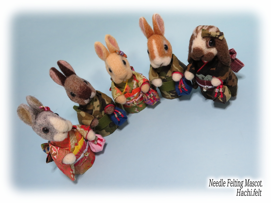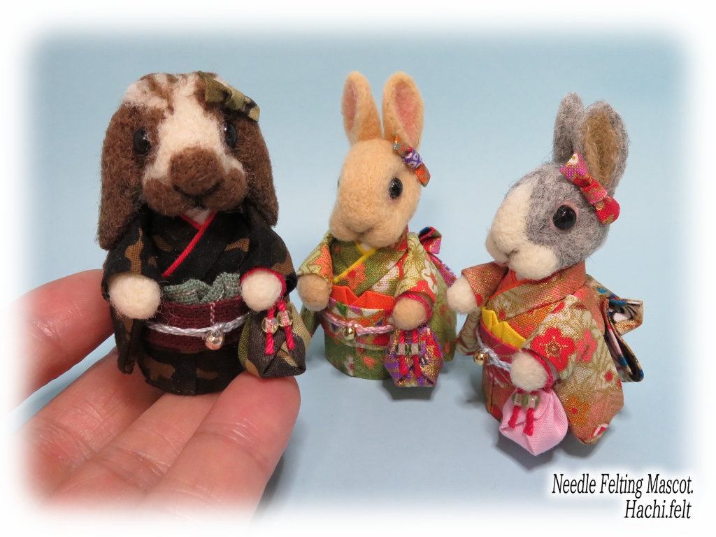 着物うさぎの追加です🐰👘今回も3羽作りました。立ち耳淡オレンジ、ロップブロークン茶、ダッチ淡グレー。とりあえず京都マルシェに出す着物うさぎは前回のも合わせて6羽で☆