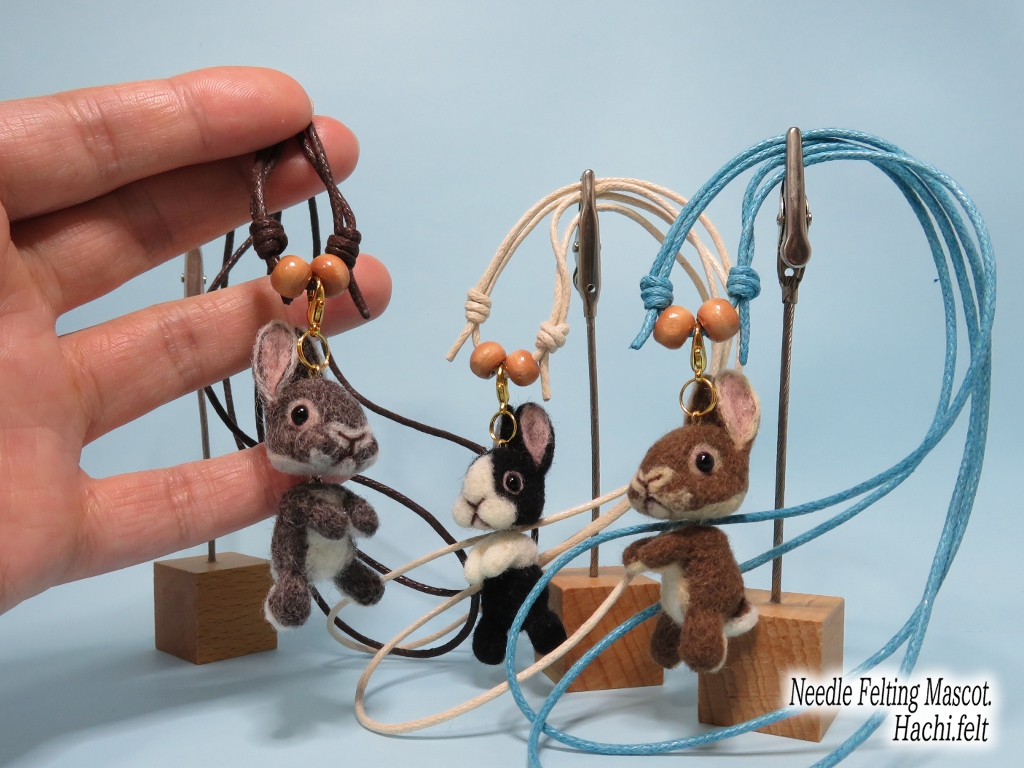 紐は結び目の所をスライドさせて倍ぐらいの長さまで伸縮可能。うさぎはチャームにしたので取り外し出来ます、紐だけ何色か用意して好きな色を選んで貰う形にしようかな。