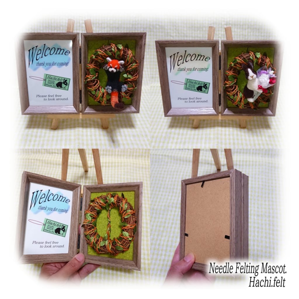 ブースにウェルカムボード的な何かを置きたくて作った物、折り畳み式。絵柄とリースの中の動物は気分で差し替えが出来ます。でも一度使っただけ…何のために作ったのか😅
