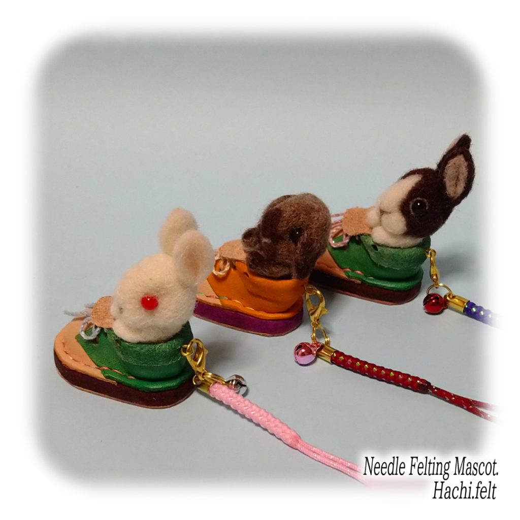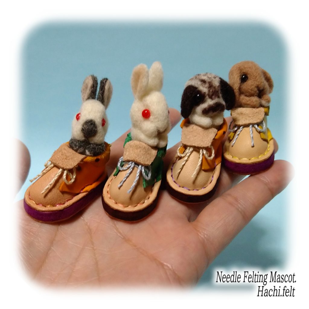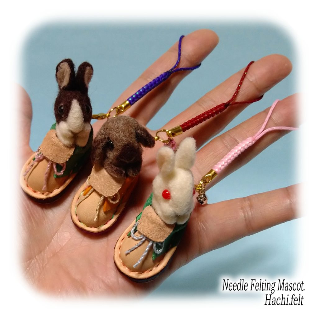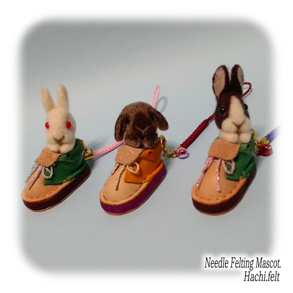 イベント販売用に靴うさぎを試作。前に制作したミニ革靴を採用、中に小さなうさぎを入れてキーホルダー型に仕上げました。